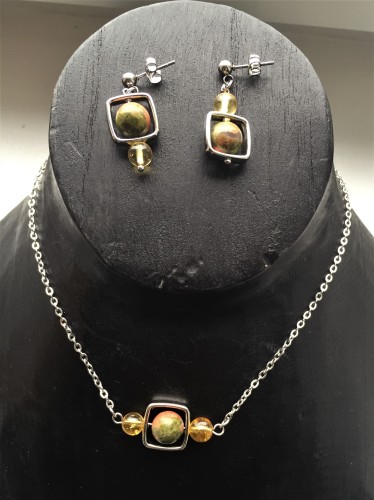 --> Un Collier ras de cou chaîne en acier inoxydable (36-42 cm), pendentif citrine et Unakite.
